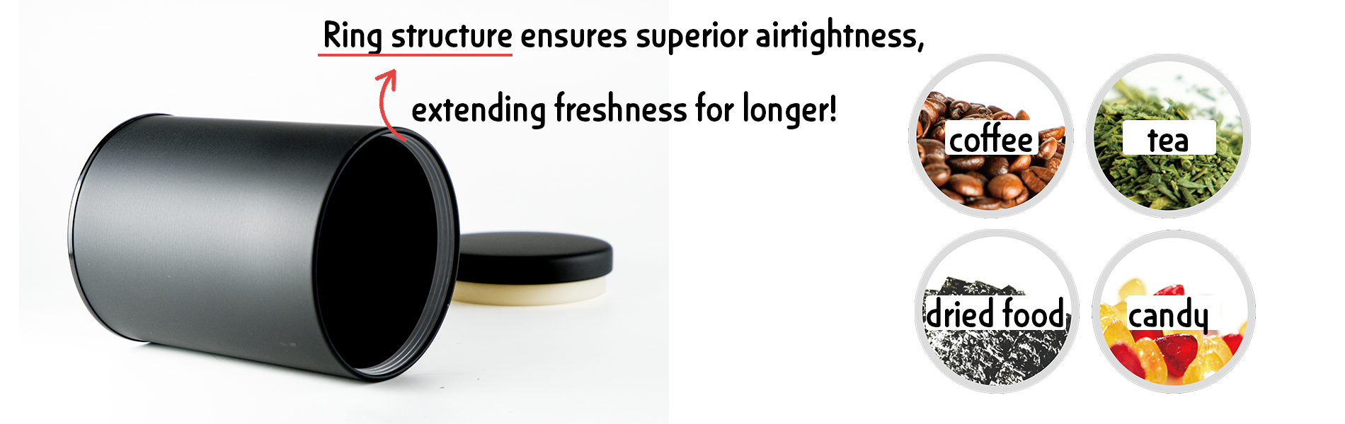 A moisture-proof lid with a ring-structured can and packing was developed to protect the delicate tea leaves and coffee beans that absorb moisture.